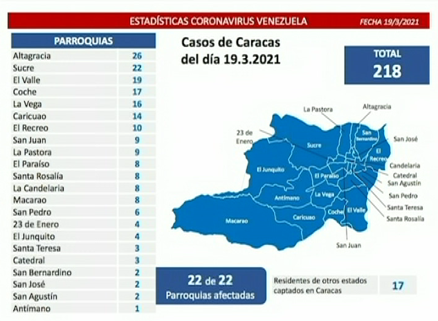 Anunció que los casos comunitarios del día de hoy, están ubicados en 21 estados: Caracas (218); Bolívar (190), Miranda (175), La Guaira (53), Yaracuy (49), Aragua (47), Carabobo (37), Nueva Esparta (33), Monagas (32), Zulia (22), Sucre (20), Falcón (14), Anzoátegui (10), Apure (7), Portuguesa (6), Lara (5), Mérida (4), Guárico (4), Trujillo (3), Cojedes (1) y Barinas (1).