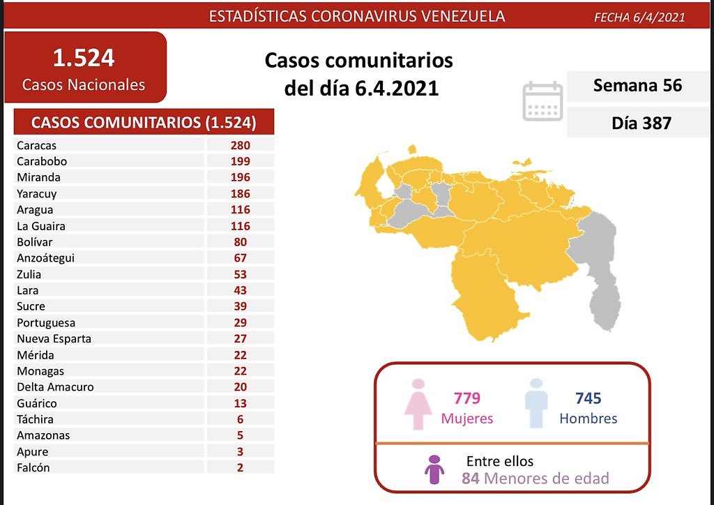 Los casos comunitarios se detectaron en 21 estados: Distrito Capital (280), Carabobo (199), Miranda (196), Yaracuy (186), Aragua (116), La Guaira (116), Bolívar (80), Anzoátegui (67), Zulia (53), Lara (43), Sucre (39), Portuguesa (29), Nueva Esparta (27), Mérida (22), Monagas (22), Delta Amacuro (20), Guárico (13), Táchira (6), Amazonas (5), Apure (3), Falcón (2).