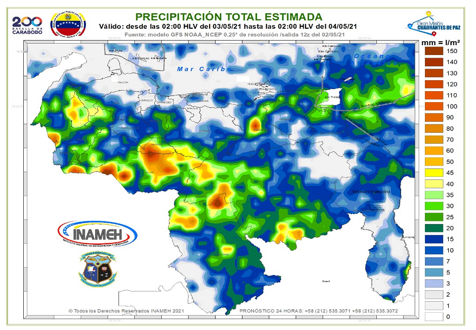 3 de mayo de 2021.- El Instituto Nacional de Meteorología e Hidrología (Inameh) reporta que se espera abundante nubosidad, algunas de gran desarrollo vertical con precipitaciones de intensidad variable, actividad eléctrica y ocasionales ráfagas de viento en gran parte de Venezuela.
