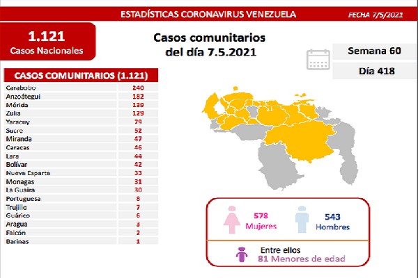 Informó que los casos comunitarios de la jornada se detectaron en: Carabobo 240, Anzoátegui 182, Mérida 139, Zulia 129, Yaracuy 79, Sucre 52, entre otros estados.