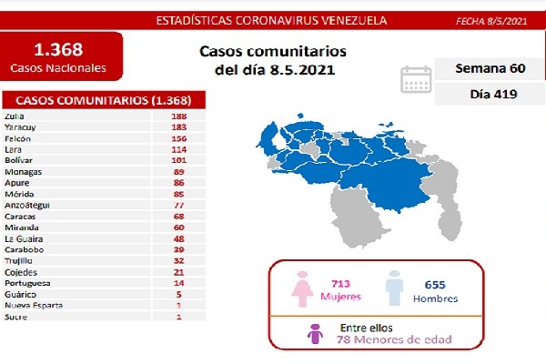 Informó que los casos comunitarios de la jornada se detectaron en: Zulia (188); Yaracuy (183); Falcón (156); Lara (114) entre otros estados.