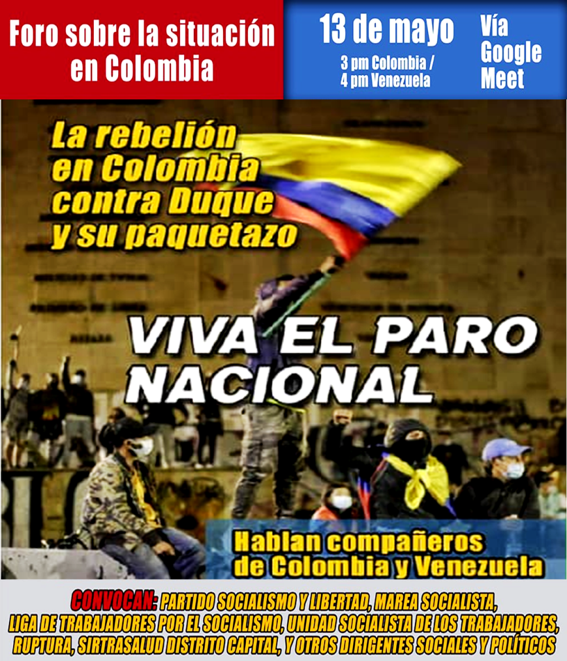 Hoy Jueves 13 de mayo se llevará a cabo vía Google Meet un Foro en Solidaridad con el Pueblo Colombiano, titulado: "La Rebelión en Colombia contra Duque y su paquetazo. Viva el Paro Nacional" el cual está pautado para comenzar a las 4 p.m. hora de Venezuela y 3 p.m. hora de Colombia.