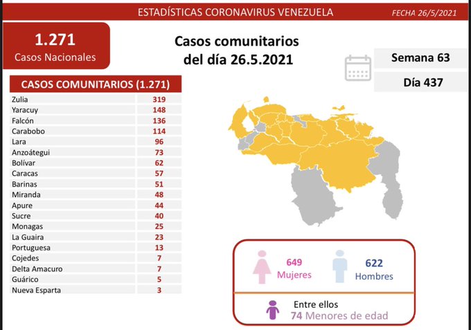 26.05.21 - La Comisión Presidencial para la Prevención y Control de la Covid-19 informó que en las últimas 24 horas se detectaron 1.271 nuevos contagios en Venezuela, todos de transmisión comunitaria.