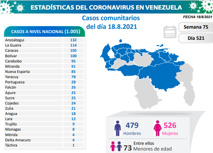 Informó que los casos comunitarios de la jornada se detectaron en 21 estados: Anzoátegui (132), La Guaira (114), Caracas (105), Bolívar (100), Carabobo (95), Miranda (91), Nueva Esparta (85), Yaracuy (78), Portuguesa (28), Falcón (26), Apure (25), Sucre (25), Cojedes (24), Zulia (21), Aragua (18), Lara (12), Trujillo (9), Monagas (8), Mérida (4), Delta Amacuro (4), Táchira (1).