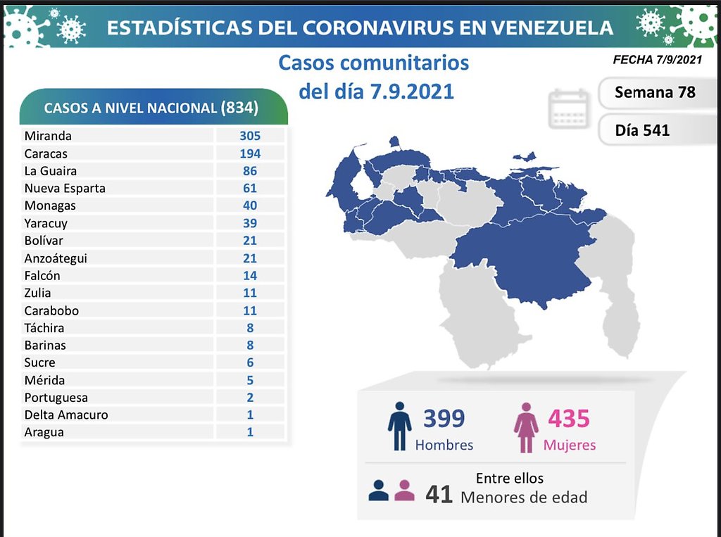 07.09.21 - La Comisión Presidencial para la Prevención y Control de la #COVID19 informa que en las últimas horas se registran un total de 834 nuevos casos en Venezuela; todos de transmisión comunitaria, de esta manera lo notificó la Vicepresidenta Ejecutiva de Venezuela, Delcy Rodríguez, a través de su cuenta de twitter @delcyrodriguezv.