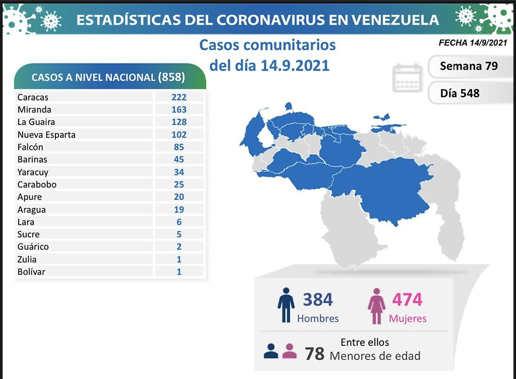 14.09.21 - En las últimas 24 horas, las autoridades de salud venezolanas identificaron un total de 858 nuevas infecciones por COVID-19, todas a través de transmisión comunitaria.