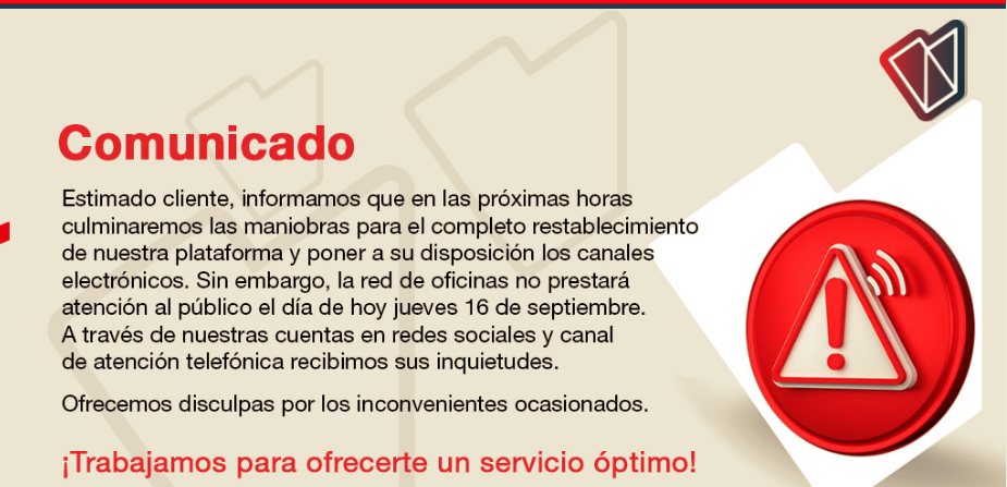 Por otro lado, informa que las oficinas de atención estarán cerradas por el día de hoy 16 de septiembre. A lo largo del día esperan solucionar los problemas y así poder seguir operando con las operaciones en líneas.