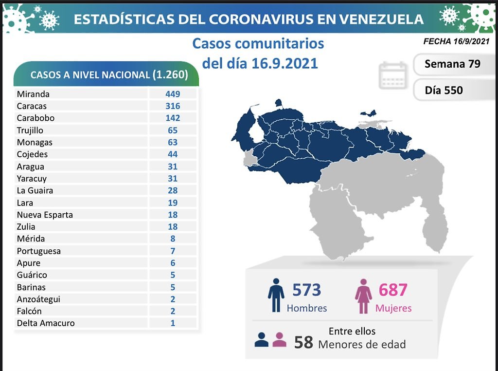16.09.21 - En las últimas 24 horas, autoridades venezolanas han identificado un total de 1.260 nuevas infecciones de COVID-19, todas por transmisión comunitaria.