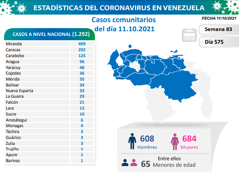 Informó que los casos comunitarios de la jornada se detectaron en 21 estados: Miranda (499), Caracas (292), Carabobo (125), Aragua (96), Yaracuy (48), Cojedes (36), Mérida (35), Bolívar (34), Nueva Esparta (33), La Guaira (29), Falcón (21), Lara (12), Sucre (10), Anzoátegui (6), Monagas (4), Táchira (3), Guárico (3), Zulia (3), Trujllo (1), Apure (1), Barinas (1).