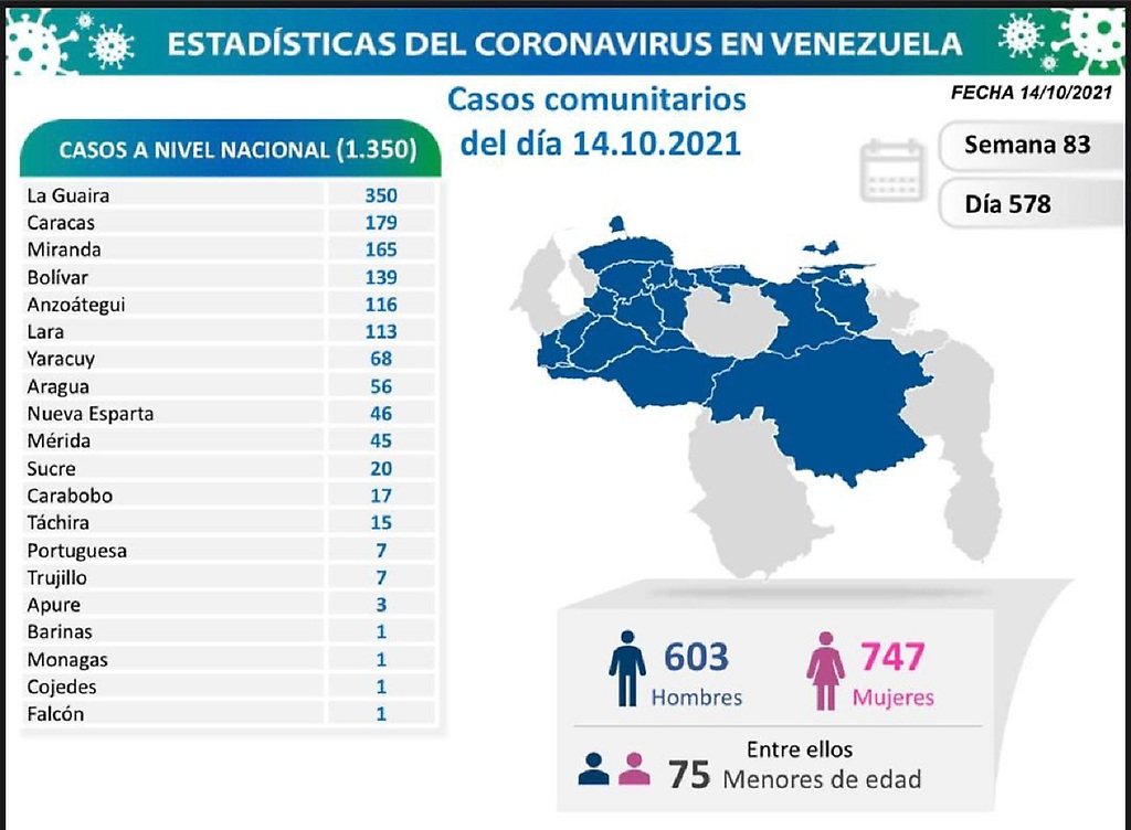 Informó que los casos comunitarios de la jornada se detectaron en 20 estados: La Guaira (350), Caracas (179), Miranda (165), Bolívar (139), Anzoátegui (116), Lara (113), Yaracuy (68), Aragua (56), Nueva Esparta (46), Mérida (45), Sucre (20), Carabobo (17), Táchira (15), Portuguesa (7), Trujillo (7), Apure (3), Barinas (1), Monagas (1), Cojedes (1), Falcón (1).