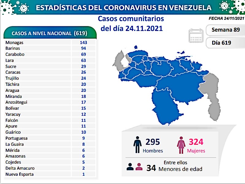 Se informó que los casos comunitarios de la jornada se detectaron en 23 estados del país: Monagas (143), Barinas (94), Carabobo (69), Lara (63), Sucre (29), Caracas (26), Trujillo (24), Táchira (20), Aragua (20), Miranda (18), Anzoátegui (17), Bolívar (15), Yaracuy (12), Falcón (11), Apure (11), Guárico (10), Portuguesa (9), La Guaira (8), Mérida (6), Amazonas (6), Cojedes (5), Delta Amacuro (2) y Nueva Esparta (1).