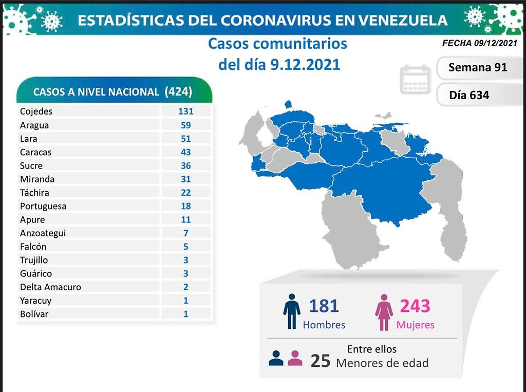Informó que los casos comunitarios de la jornada se detectaron en 16 estados del país: Cojedes (131), Aragua (59), Lara (51), Caracas (43), Sucre (36), Miranda (31), Táchira (22), Portuguesa (18), Apure (11), Anzoátegui (7), Falcón (5), Trujillo (3), Guárico (3), Delta Amacuro (2), Yaracuy (1) y Bolívar (1).