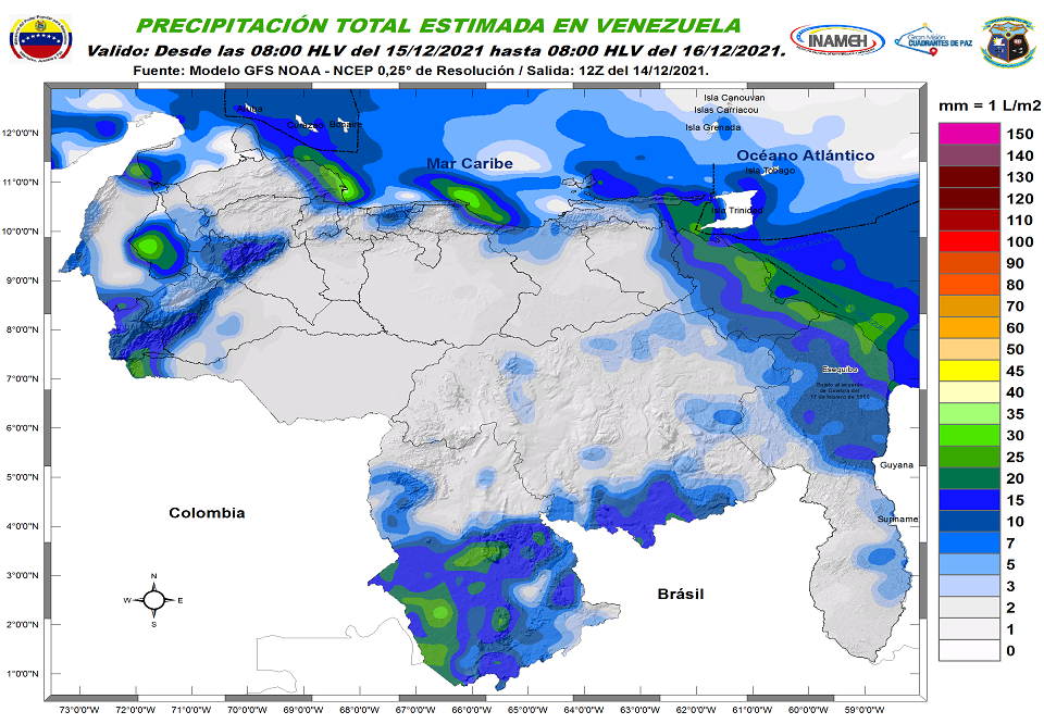 15 de diciembre de 2021.- De acuerdo al pronóstico del tiempo para las próximas 24 horas, el Instituto Nacional de Meteorología e Hidrología, INAMEH, los vientos alisios continúan transportando humedad sobre las costas, generando mantos nubosos con lluvias y lloviznas dispersas en las zonas: Delta Amacuro, Nororiente, región insular, Centro Norte Costero y Falcón.