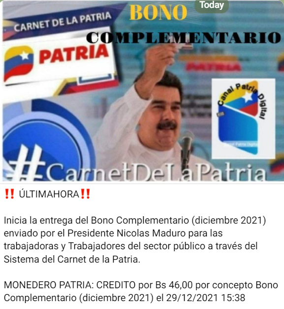 Hoy miércoles 29 de diciembre comenzó el pago del Bono Complementario a empleados públicos activos y jubilados a través del Carnet de la Patria, informó hace pocos minutos el Canal Patria Digital en Telegram.