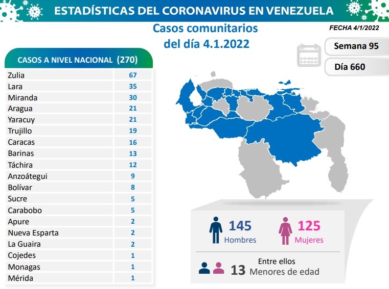 Informó que los casos comunitarios de la jornada se detectaron en 19 estados del país: Zulia (67), Lara (35), Miranda (30), Aragua (21), Yaracuy (21), Trujillo (19), Caracas (16), Barinas (13), Táchira (12), Anzoátegui (9), Bolívar (8), Sucre (5), Carabobo (5), Apure (2), Nueva Esparta (2), La Guaira (2), Cojedes (1), Monagas (1), Mérida (1).