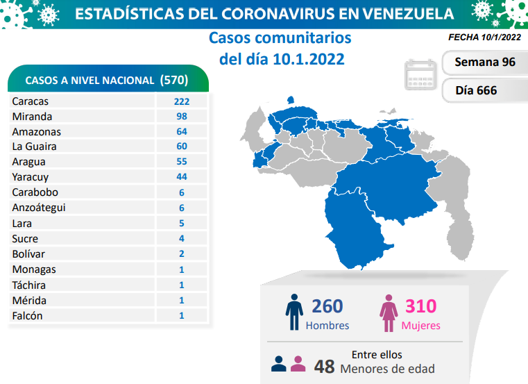 Indicó que los casos comunitarios de la jornada se detectaron en 15 estados del país: Caracas (222), Miranda (98), Amazonas (64), La Guaira (60), Aragua (55), Yaracuy (44), Carabobo (6), Anzoátegui (6), Lara (5), Sucre (4), Bolívar (2), Monagas (1), Táchira (1), Mérida (1), Falcón (1).