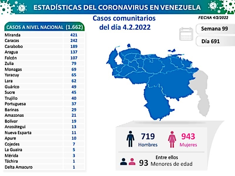 Informó que los casos comunitarios de la jornada se detectaron en 24 entidades del país: Miranda 421, Caracas 242, Carabobo 189, Aragua 137, Falcón 107, Zulia 79, Monagas 69, Yaracuy 65, Lara 62, Guárico 49, Sucre 45, Trujillo 40, Portuguesa 37, Barinas 29, Amazonas 21, Bolívar 19, Anzoátegui 13, Nueva Esparta 11, Apure 10, Cojedes 7, La Guaira 5, Mérida 3, Táchira 1, Delta Amacuro 1.