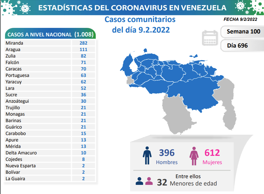 Informó que los casos comunitarios de la jornada se detectaron en 22 entidades del país: Miranda 282, Aragua 111, Zulia 82, Falcón 71, Caracas 70, Portuguesa 63, Yaracuy 62, Lara 52, Sucre 36, Anzoátegui 30, Trujillo 21, Monagas 21, Barinas 21, Guárico 21, Carabobo 15, Apure 13, Mérida 13, Delta Amacuro 10, Cojedes 8, Nueva Esparta 2, Bolívar 2 y La Guaira 2.