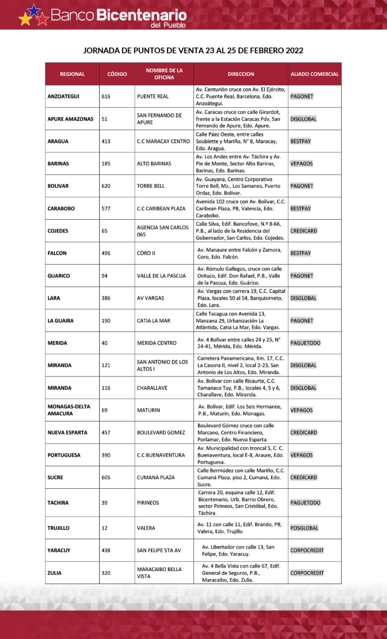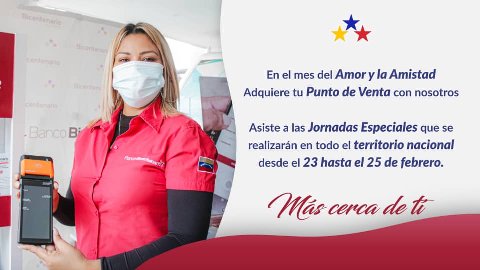 15 de febrero de 2022.- El Banco Bicentenario del Pueblo invita a todos los comerciantes y personas naturales a adquirir puntos de ventas configurados a la plataforma de la entidad financiera, con la tecnología de sus aliados comerciales, a través de jornadas especiales habilitadas en el territorio nacional, desde el 23 al 25 de febrero.