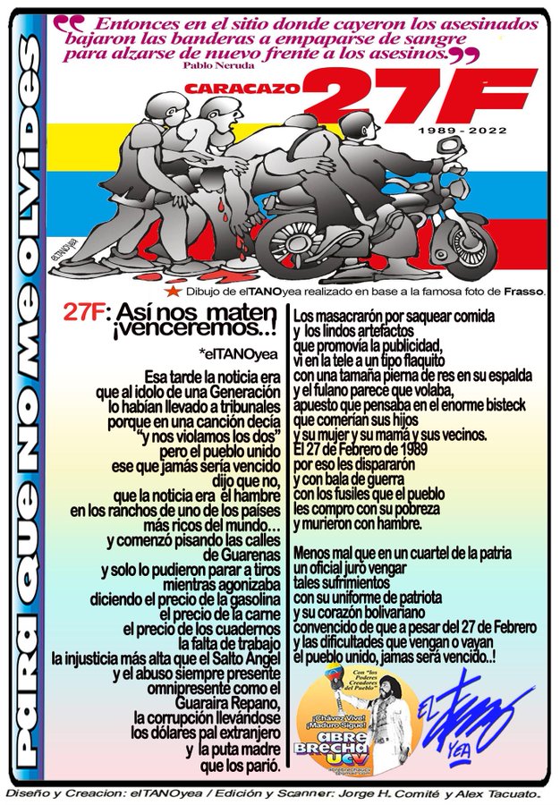 27 de febrero de 2022.- El mundo no podía creerlo, en la Venezuela saudita, la del ta´barato dame dos, mataban a la gente por reclamar su hambre y la injusticia, en tiempos en que nadie nos bloqueaba ni nos agredía con sanciones ilegales... Más de 4.000 asesinadxs!