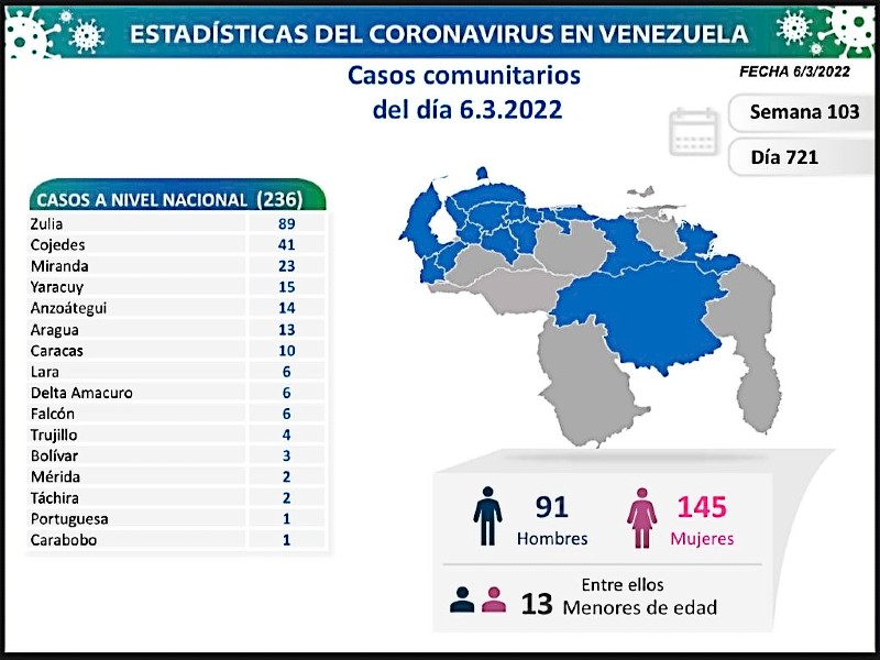 Informó que los casos comunitarios de la jornada se detectaron en 16 estados: Zulia (89), Cojedes (41), Miranda (23), Yaracuy (15), Anzoátegui (14), Aragua (13), Caracas (10), Lara (6), Delta Amacuro (6), Falcón (6), Trujillo (4), Bolívar (4), Mérida (2), Táchira (2), Portuguesa (1), Carabobo (1).