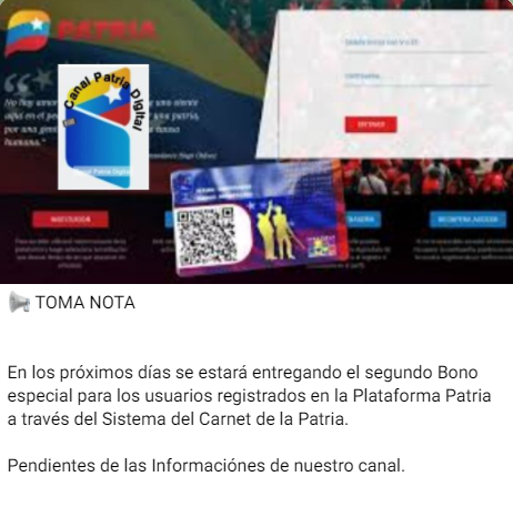 Este miércoles 9 de marzo anunciaron el 2° bono especial del Sistema del Carnet de la Patria para los próximos días, informó el canal de Telegram Patria Digital.