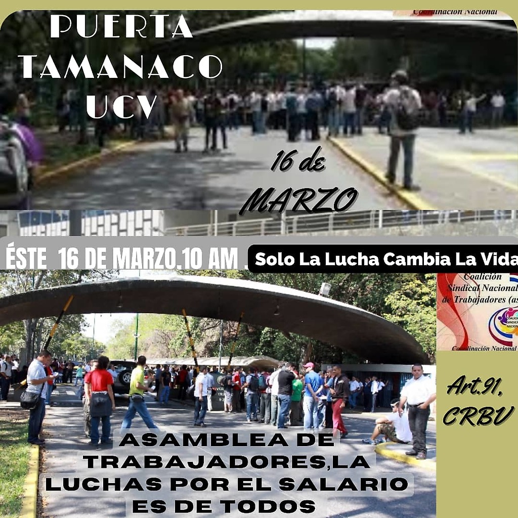 16 de marzo de 2021.- Invitación a las organizaciones sindicales, gremios, trabajadores, jubilados y pensionados a acompañar y realizar la Asamblea General de Trabajadores para continuar la Movilización por la Defensa de los Derechos Constitucionales con relación al Salario y las Convenciones Colectivas: por condiciones dignas de trabajo, seguridad social y proteccion de las familias trabajadoras que ahora no viven únicamente de su Salario ni de la miserable trampa de la Bonificaciòn Salarial.