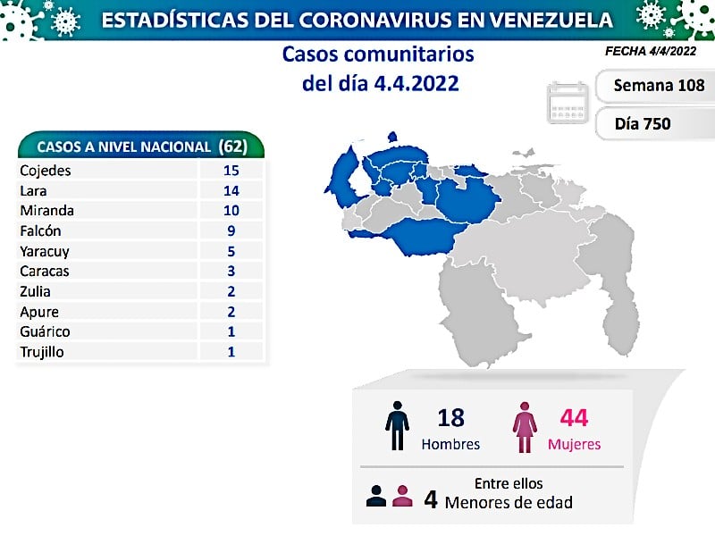 Informó que los casos comunitarios de la jornada se detectaron en 10 estados: Cojedes (15), Lara (14), Miranda (10), Falcón (9), Yaracuy (5), Caracas (3), Zulia (2), Apure (2), Guárico (1) y Trujillo (1).