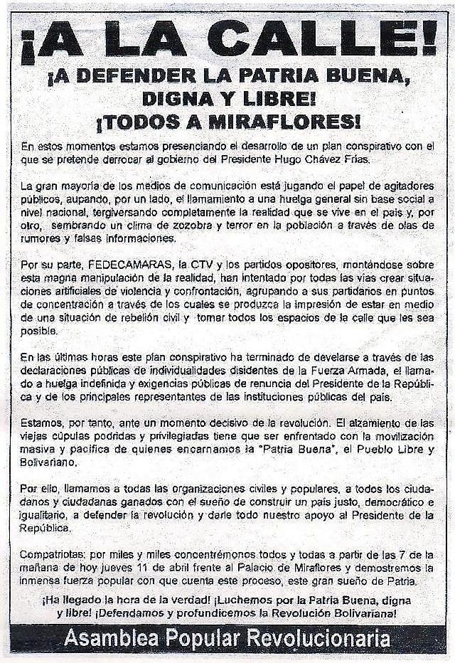 La APR distribuyó cerca de 100 mil volantes en los barrios en la madrugada del 11 de abril y llamó por todos los medios a su alcance para que el pueblo se concentrara en Miraflores, a fin de disuadir la desviación de la marcha opositora premeditadamente vinculada a la operación golpista. Esa marcha era promovida por el bloque de empresarios, gerentes de la industria petrolera, partidos de la burguesía, ONGs elitescas que se autocalifican y pretenden monopolizar la denominación de "sociedad civil", los burócratas sindicales corrompidos y fraudulentos de la CTV, la rancia cúpula eclesiástica y los militares anti-constitucionalistas; todo ello con el auspicio y monitoreo del Departamento de Estado de USA y la CIA.