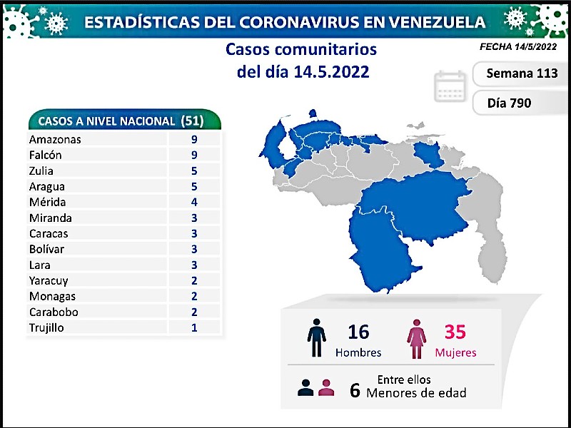 Informó que los casos comunitarios de la jornada se detectaron en 13 estados: Amazonas (9), Falcón (9), Zulia (5), Aragua (5), Mérida (4), Miranda (3), Caracas (3), Bolívar (3), Lara (3), Yaracuy (2), Monagas (2), Carabobo (2) y Trujillo (1).