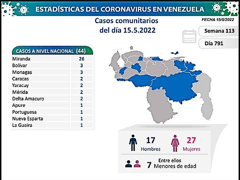 Informó que los casos comunitarios de la jornada se detectaron en 11 estados: Miranda (26), Bolívar (3), Monagas (3), Caracas (2), Yaracuy (2), Mérida (2), Delta Amacuro (2), Apure (1), Portuguesa (1), Nueva Esparta (1) y La Guaira (1).