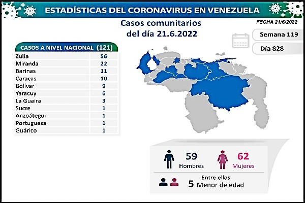 Informó que los casos comunitarios de la jornada se detectaron en 11 estados y están ubicados en: Zulia (56), Miranda (22), Barinas (11), Caracas (10), Bolívar (9), Yaracuy (6), La Guaira (3), Sucre (1), Anzoátegui (1). Portuguesa (1) y Guárico (1).