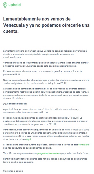 "Lamentamos mucho comunicarles que Uphold decidió retirarse de Venezuela debido a la creciente complejidad del cumplimiento de las sanciones estadounidenses".