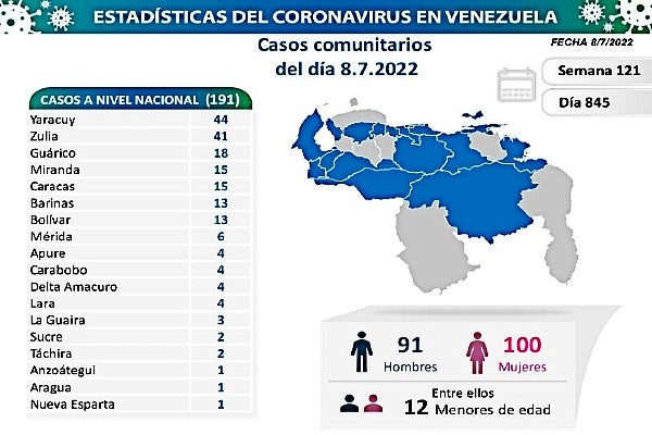 Informó que los casos comunitarios de la jornada se detectaron en los estados: Yaracuy 44, Zulia 41, Guárico 18, Miranda 15, Caracas 15, Barinas 13, Bolívar 13, Mérida 6, Apure 4, Carabobo 4, Delta Amacuro 4, Lara 4, La Guaira 3, Sucre 2, Táchira 2, Anzoátegui 1, Aragua 1 y Nueva Esparta 1.