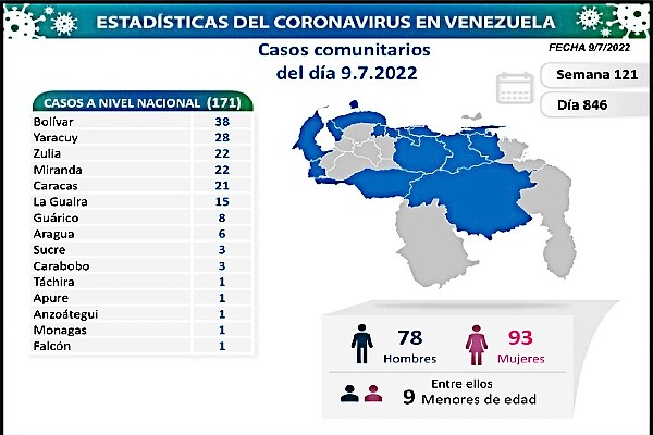 Informó que los casos comunitarios de la jornada se detectaron en los estados: Bolívar (38), Yaracuy (28), Zulia (22), Miranda (22), Caracas (21), La Guaira (15), Guárico (8), Aragua (6), Sucre (3), Carabobo (3), Táchira (1), Apure (1), Anzoátegui (1), Monagas (1) y Falcón (1).