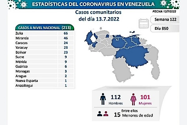 Se informó que los casos comunitarios de la jornada se detectaron en los estados: Zulia 66, Miranda 46, Caracas 24, Yaracuy 23, Bolívar 23, Sucre 9, Mérida 9, Guárico 6, Monagas 3, Aragua 2, Nueva Esparta 1 y Anzoátegui 1.