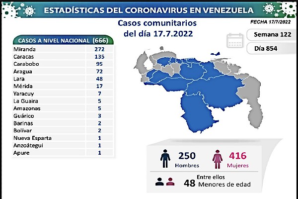 Informó que los casos comunitarios de la jornada se detectaron en los estados: Miranda 272, Caracas 135, Carabobo 95, Aragua 72, Lara 48, Mérida 17, Yaracuy 7, La Guaira 5, Amazonas 5, Guárico 3, Barinas 2, Bolívar 2, Nueva Esparta 1, Anzoátegui 1 y Apure 1.
