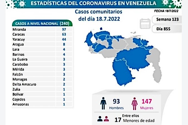 Informó que los casos comunitarios de la jornada se detectaron en los estados: Miranda (97), Caracas (63), Yaracuy (44), Aragua (8), Lara (4), Barinas (4), La Guaira (3), Carabobo (3), Mérida (3), Falcón (3), Monagas (2), Delta Amacuro (2), Zulia (1), Bolívar (1), Cojedes (1) y Amazonas (1).