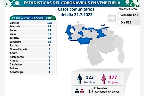 Informó que los casos comunitarios de la jornada se detectaron en los estados: Caracas (108), Miranda (67), Sucre (33), Zulia (31), Yaracuy (28), La Guaira (10), Táchira (7), Nueva Esparta (5), Apure (3), Portuguesa (3), Aragua (2), Carabobo (1), Anzoátegui (1) y Bolívar (1).
