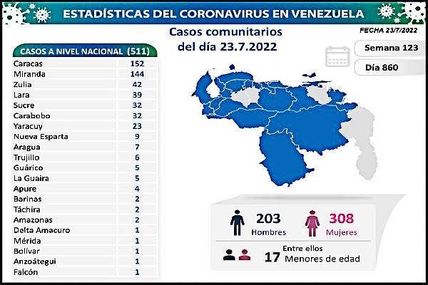 Señaló que los casos comunitarios de la jornada se detectaron en los estados: Caracas (152), Miranda (144), Zulia (42), Lara (39), Sucre (32), Carabobo(32), Yaracuy (23), Nueva Esparta (9), Aragua (7), Trujillo (6), Guárico (5), La Guaira (5), Apure (4), Barinas (2), Táchira (2), Amazonas (2), Delta Amacuro (1), Mérida (1), Bolívar (1), Anzoátegui (1) y Falcón (1).