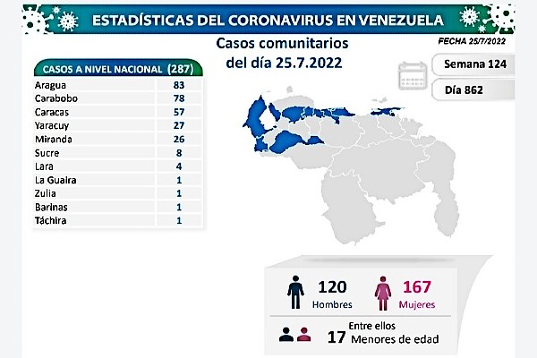 Informó que los casos comunitarios de la jornada se detectaron en los estados: Aragua 83, Carabobo 78, Caracas 57, Yaracuy 27, Miranda 26, Sucre 8, Lara 4, La Guaira 1, Zulia 1, Barinas 1 y Táchira 1.