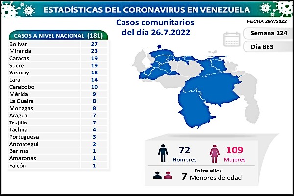 Señaló que el estado Bolívar fue la entidad que hoy registró el mayor número de contagios comunitarios con (27) casos, en 3 municipios; seguido por las entidades: Miranda (23), Caracas (19), Sucre (19) y Yaracuy (18).