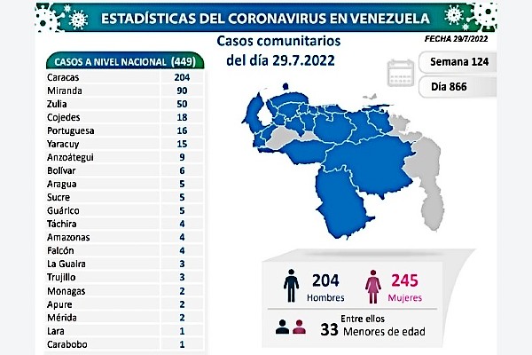 Se informó que los casos comunitarios de la jornada se detectaron en los estados: Caracas 204, Miranda 90, Zulia 50, Cojedes 18, Portuguesa 16, Yaracuy 15, Anzoátegui 9, Bolívar 6, Aragua 5, Sucre 5, Guárico 5, Táchira 4, Amazonas 4, Falcón 4, La Guaira 3, Trujillo 3, Monagas 2, Apure 2, Mérida 2, Lara 1 y Carabobo 1.