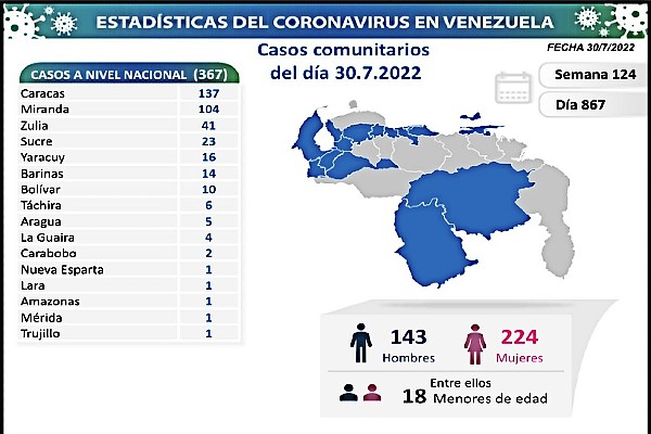 Se informó que los casos comunitarios de la jornada se detectaron en los estados: Caracas 137, Miranda 104, Zulia 41, Sucre 23, Yaracuy 16, Barinas 14, Bolívar 10, Táchira 6, Aragua 5, La Guaira 4, Carabobo 2, Nueva Esparta 1, Lara 1, Amazonas 1, Mérida 1 y Trujillo 1.