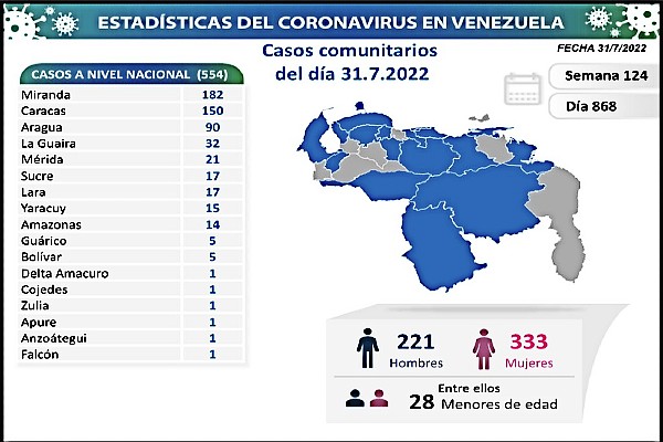 La Comisión Presidencial para la Prevención, Atención y Control de la covid-19, reportó este domingo 31 de julio en la noche 559 nuevos contagios a 868 días de la pandemia. De esa cantidad, 554 fueron casos de transmisión comunitaria y 5 importados.