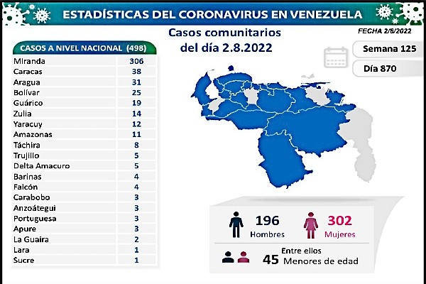 Se Informó que los casos comunitarios de la jornada se detectaron en los estados: Miranda (306), Caracas (38), Aragua (31), Bolívar (25), Guárico 19, Zulia 14, Yaracuy 12, Amazonas 11, Táchira 8, Trujillo 5, Delta Amacuro 5, Barinas 4, Falcón 4, Carabobo 3, Anzoátegui 3, Portuguesa 3, Apure 3, La Guaira 2, Lara 1 y Sucre 1.
