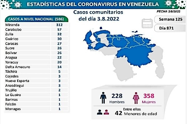 Indicó que los casos comunitarios están ubicados en los siguientes estados: Miranda 312, Carabobo 57, Zulia 32, Guárico 30, Caracas 27, Sucre 26, Bolívar 26, Aragua 22, Yaracuy 20, Delta Amacuro 14, Táchira 5, Cojedes 3, Nueva Esparta 3, Anzoátegui 3, Trujillo 2, La Guaira 1, Barinas 1, Falcón 1 y Monagas 1.