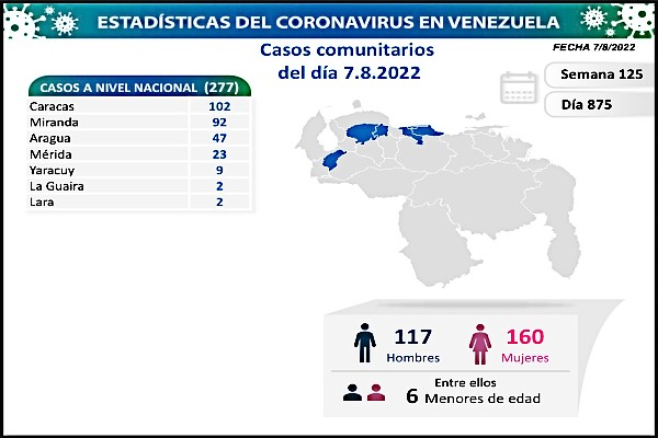 La vicepresidenta Ejecutiva de la República, Delcy Rodríguez, informó que los casos comunitarios están ubicados en los siguientes estados: Caracas (102), Miranda (92), Aragua (47), Mérida (23), Yaracuy (9), La Guaira (2) y Lara (2).