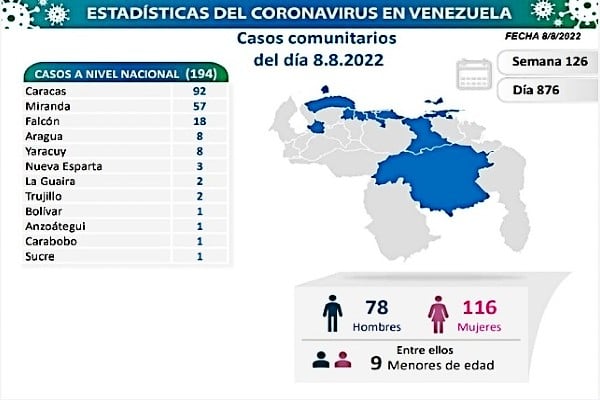 Informó que los casos comunitarios están ubicados en los siguientes estados: Caracas 92, Miranda 57, Falcón 18, Aragua 8, Yaracuy 8, entre otros que se describen a continuación: Caracas presenta hoy el mayor número de contagios en 16 de sus 22 parroquias: Sucre 21, Altagracia 9, El Valle 9, 23 de Enero 8, San Juan 7, Santa Rosalía 7, Caricuao 5, El Recreo 5, El Paraiso 4, La Vega 4, La Candelari 2, San Agustín 3, El Junquito 2, La Pastora 2, Macarao 2, San Pedro 1.