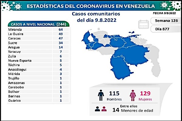 Venezuela reportó en el día 877 de pandemia de la covid-19 en las últimas 24 horas se registraron 246 nuevos casos: 244 por transmisión comunitaria y 2 importados, así lo Informó la vicepresidenta ejecutiva de la República y presidenta de la comisión para la atención y prevención de esta enfermedad viral, Delcy Rodríguez.